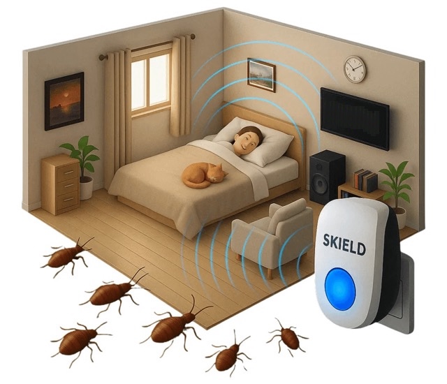 Der BugShield™ arbeitet mit modulierter Hochfrequenztechnologie, die speziell darauf ausgelegt ist, Milben zu stören – nicht Menschen.