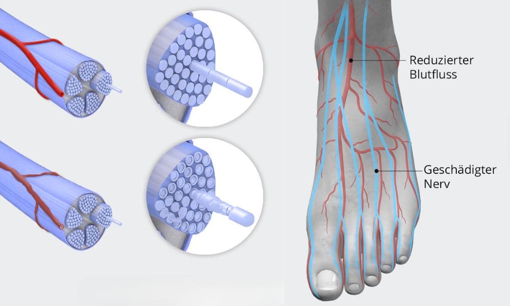 Aus all diesen Gründen wird die Sauerstoffversorgung der peripheren Nerven verringert, was zu einer Schädigung des Nervengewebes führt. Dies verursacht brennende Schmerzen, unerträgliches Kribbeln und schließlich Taubheitsgefühle.